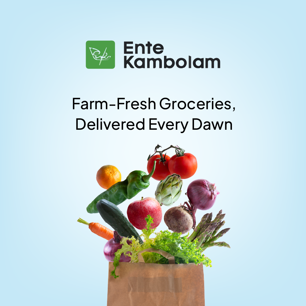 Download the Ente Kambolam app from the App Store or Play Store and get farm-fresh groceries delivered every morning.